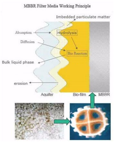 The suspended medias as carrier for the growth and attachment of microorganisms are directly put into the MBBR system. The waste water go through the suspended carriers in MBBR reactor, microorganisms attach themselves to submerged moving biofilm carrier, forming a biofilm. Air is transferred into the water, mixing the media and water and providing oxygen to the bacteria. The biofilm absorbs, oxidizes and reduces organic and inorganic material thus providing treatment.The carriers can move freely in the reactor with the mixing of the water; for the aerobic reactor, the aeration will make the media move; for the anaerobic reactor, mechanic mixing will make the media move.