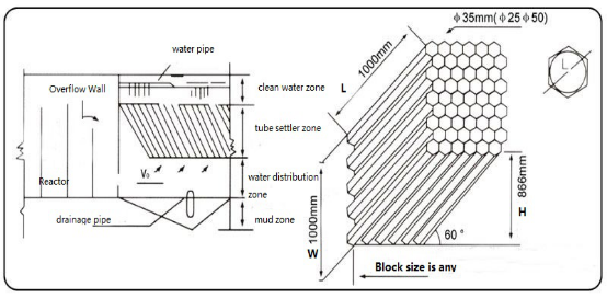 3.As long as inclined tube is 1meter, effective loadis designed by 3-5 tons/m 2 .VO in 2.5-3.0 mm/sec range and best water quality.