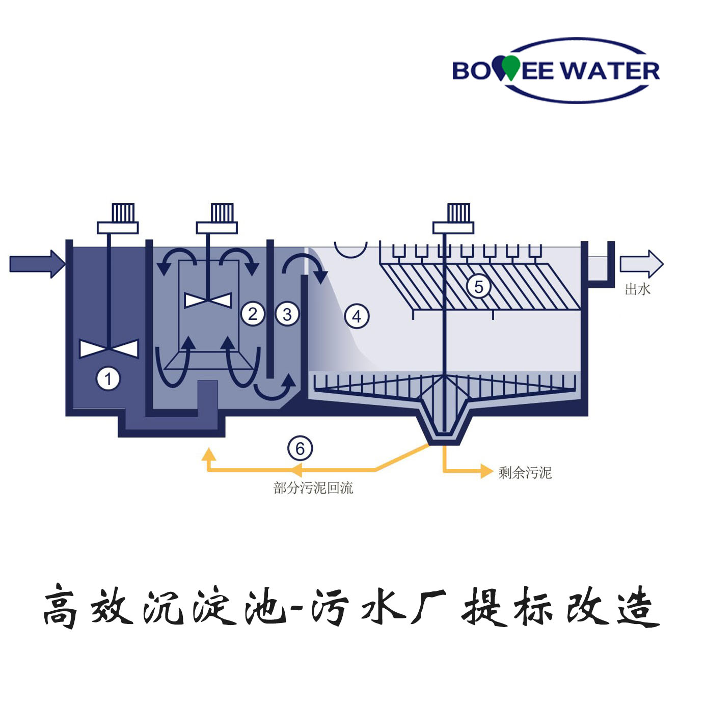 混凝劑投加在原水中,在快速攪拌器的作用下同污水中懸浮物快速混合,通過中和顆粒表面的負電荷使顆粒 “脫穩(wěn) ”,形成小的絮體然后進入絮凝池。同時原水中的磷和混凝劑反應(yīng)形成磷酸鹽達到化學(xué)除磷的目的。回流的污泥和混凝形成的小絮體在快速攪拌器的作用快速混合,并以污泥為核心形成密度更大、更重的絮體,以利于在沉淀池中的快速沉淀。